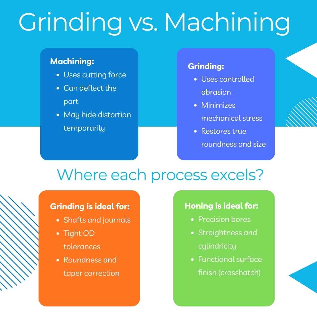 Grinding and honing serve a different role entirely: they reset geometry without re-stressing the part.