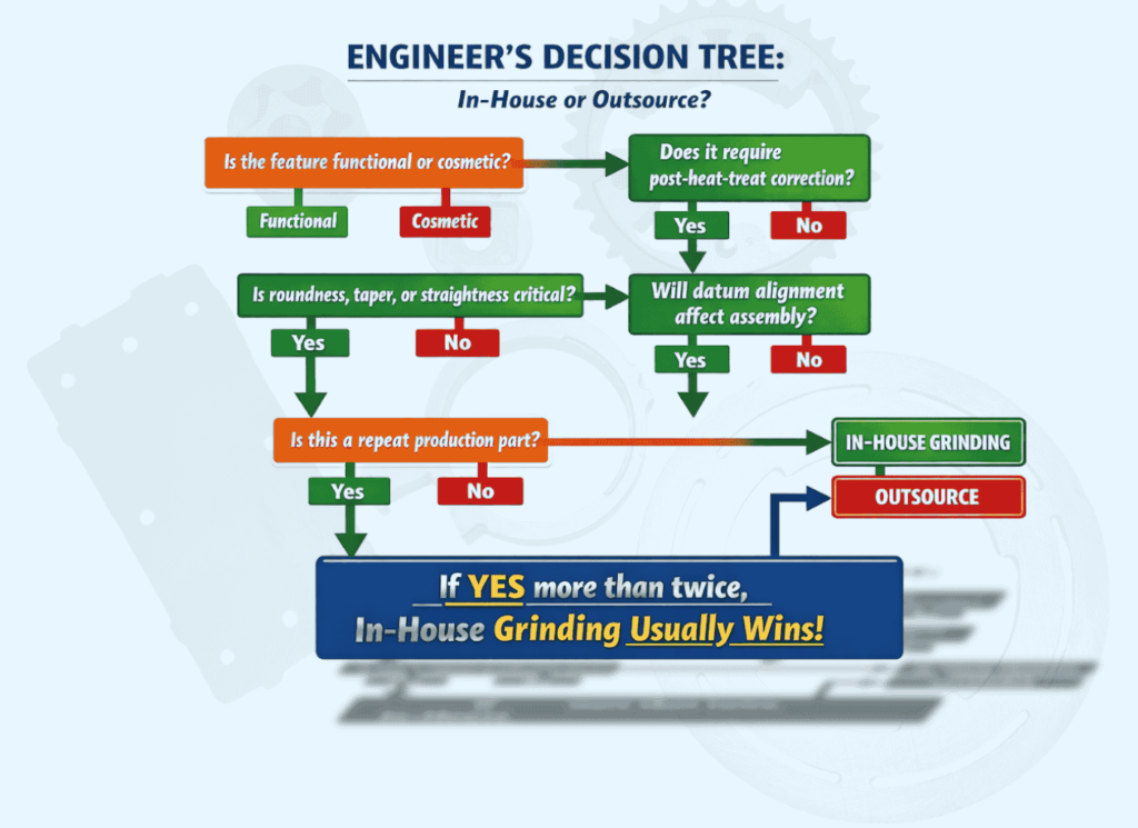 The decision to keep grinding in-house or outsource it affects tolerance capability, scrap risk, lead time, and total cost far more than most engineers expect.